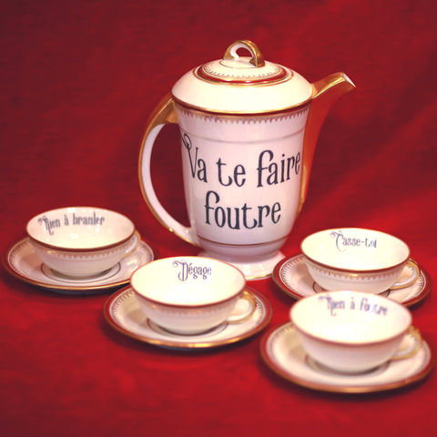 We use the same special professional ceramic decals that were used to originally used to create these pieces. They are lovingly applied to the porcelain and then kiln fired at very high temperatures so that they fuse with the glaze. Our vile phrases will not fade or rub off, and are food safe and useable on a daily basis.